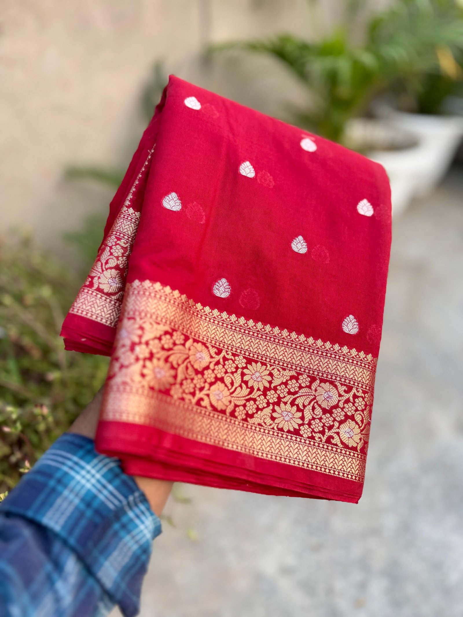 The Katan georgette saree is a lightweight and easy-to-drape piece, perfect for any occasion. Featuring delicate mina buti motifs scattered across the body, it offers a graceful and contemporary touch. The soft flow of the fabric enhances comfort while maintaining an elegant silhouette, making it an ideal choice for both casual and festive wear.