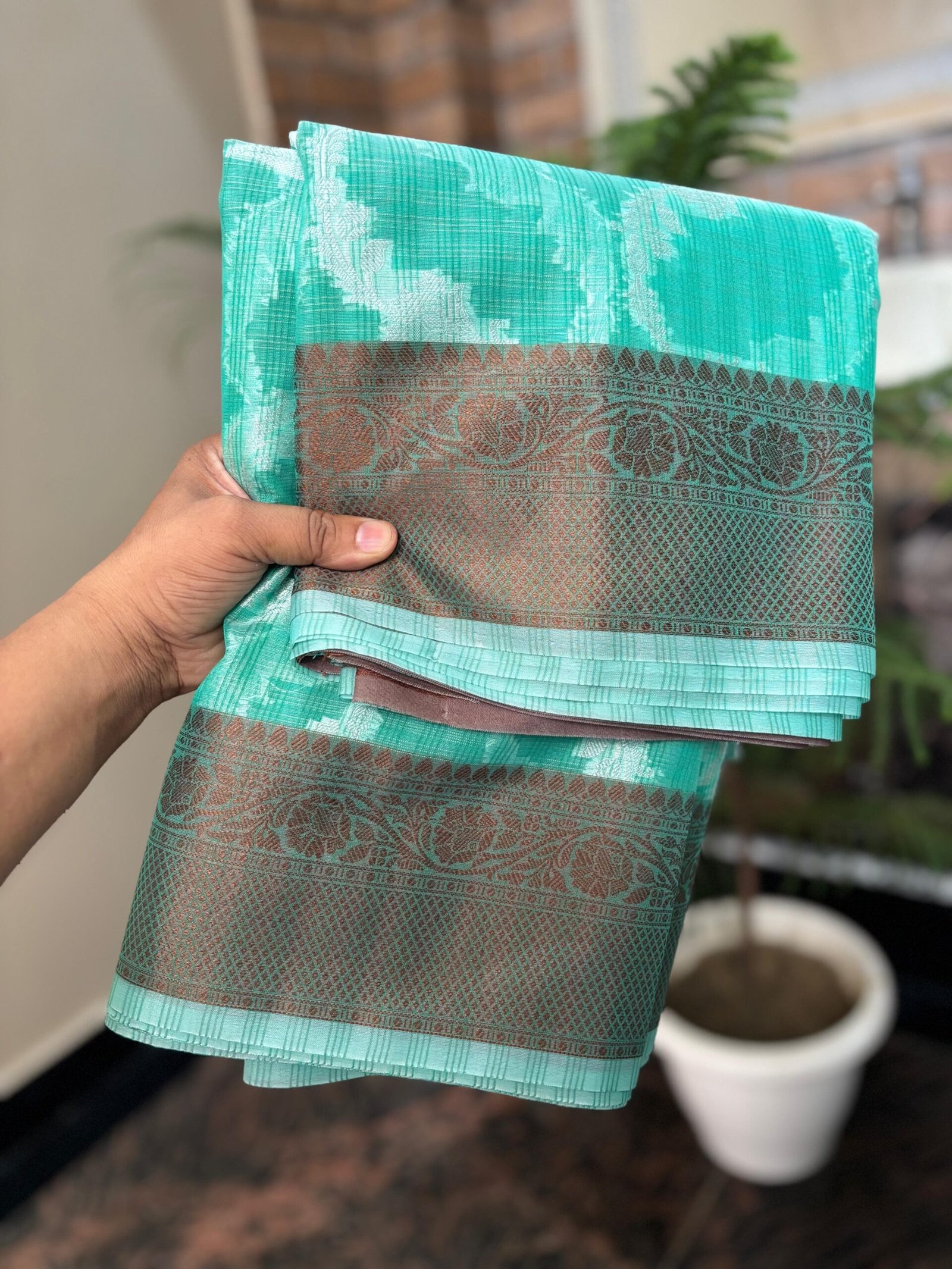 The kota check saree showcases a charming jaal design across the body, adding a touch of grace to its lightweight fabric. The elegant zari weave floral pattern along the border enhances its beauty, creating a perfect blend of tradition and style. Ideal for festive occasions, this saree is both versatile and striking.