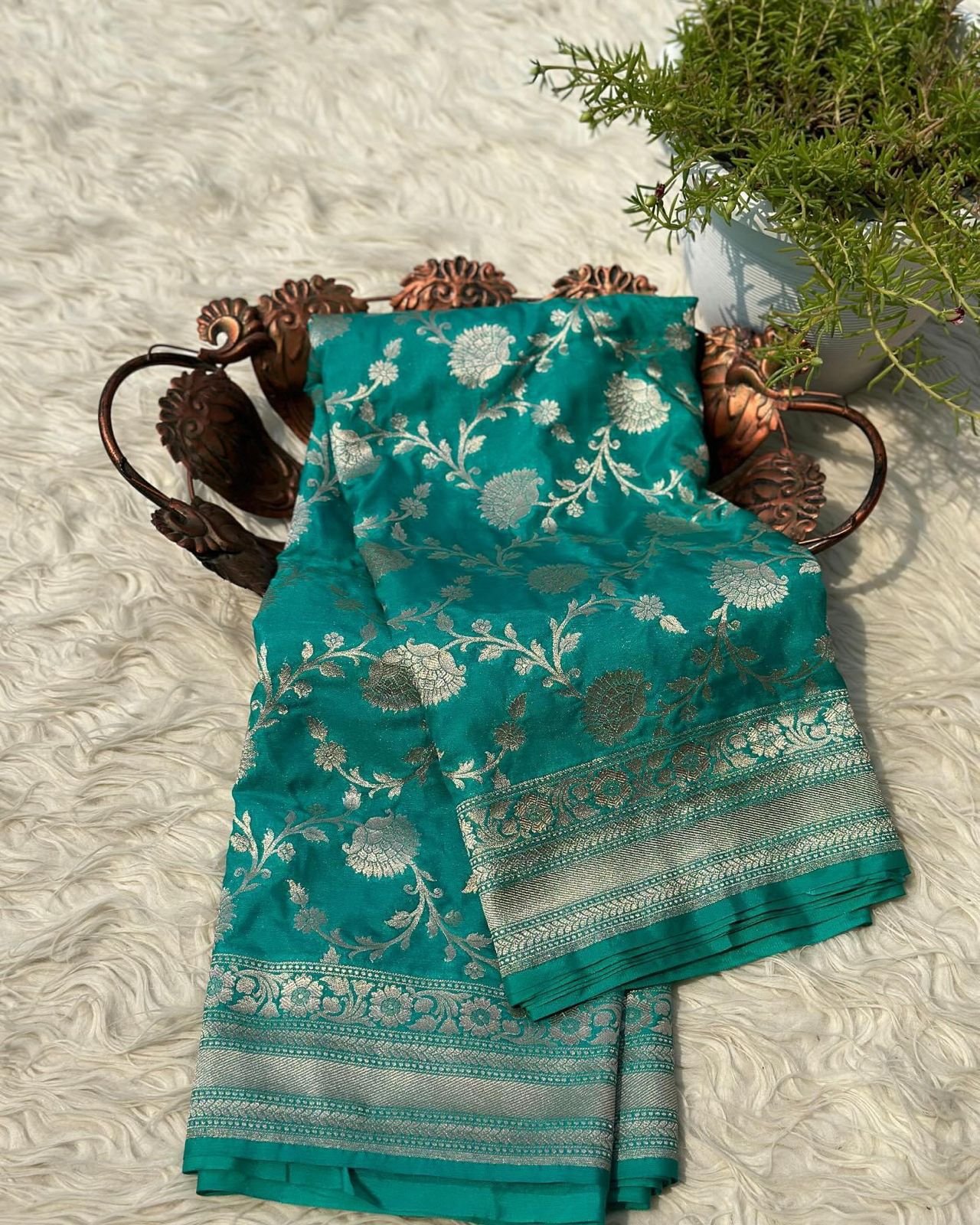 A Banarasi mushroo katan silk saree showcases a rich, lustrous texture with a stunning jaal design elegantly woven across the body. The blend of silk and soft fibers ensures a luxurious feel while providing a beautiful drape. Ideal for special occasions, this saree embodies traditional artistry and sophistication, making it a timeless addition to any wardrobe.