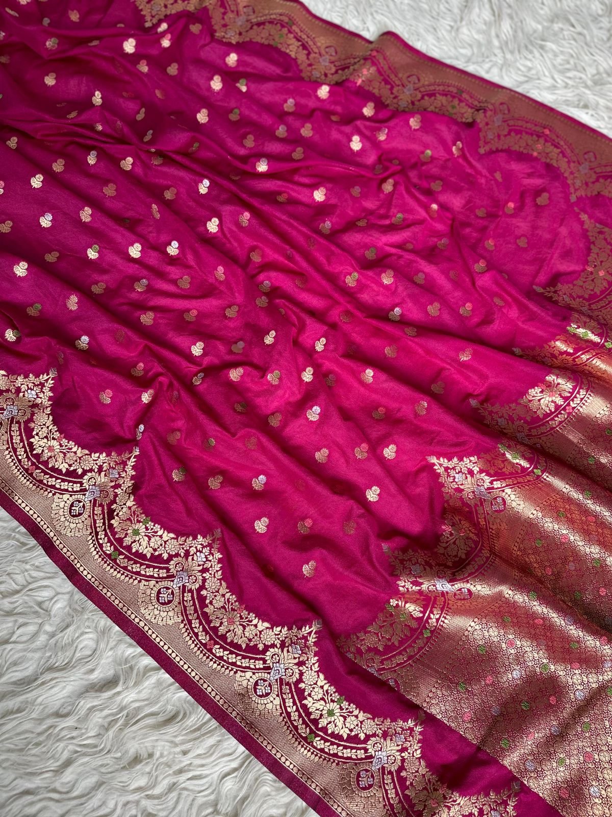 The Banarasi viscose georgette saree is elegantly adorned with delicate small alfi butis throughout the body, creating a subtle yet sophisticated look. The minkari border design adds a rich contrast, enhancing the saree’s overall allure. Perfect for festive occasions, this saree combines traditional craftsmanship with contemporary style.