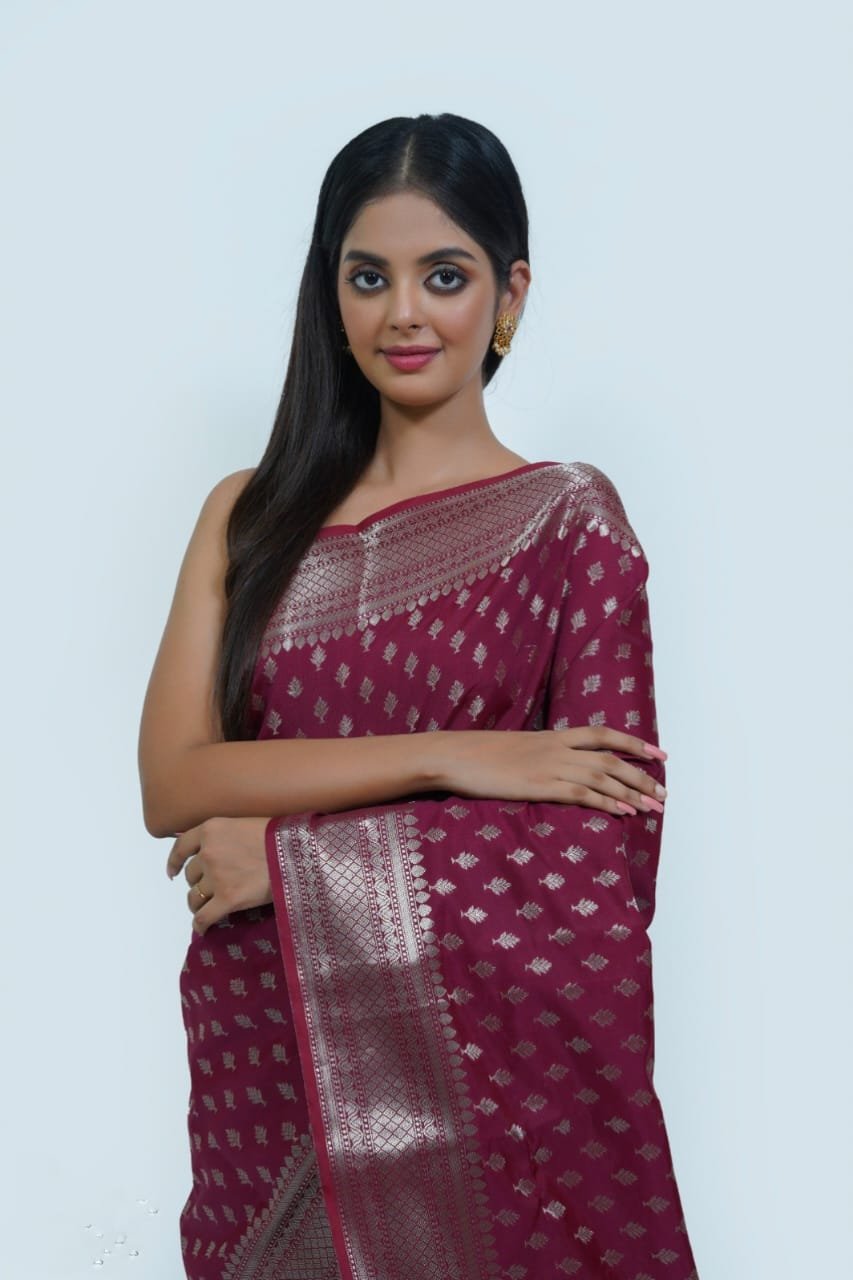 A Banarasi semi-katan silk saree featuring a delicate, all-over small buti design that adds a touch of elegance and intricacy to the fabric. The saree is complemented by a stunningly attractive pallu, rich in traditional patterns, making it a perfect blend of classic charm and contemporary grace. Ideal for special occasions, this saree showcases the timeless artistry of Banarasi weaving.